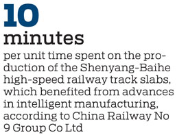 Meanwhile, construction of this railway has benefited from advances in intelligent manufacturing. Its "base-like" track slabs are key in allowing trains to run smoothly at high speeds. Notably, production of the Shenyang-Baihe high-speed railway track slabs, each measuring 5.6 meters in length and 2.5 meters in width, now takes only 10 minutes per unit, with height variations controlled to within the thickness of a human hair, greatly enhancing both precision and efficiency, said Yang Zhenhua, an official from China Railway No 9 Group Co Ltd.