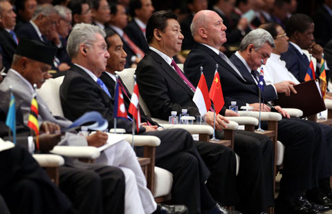 A security guard stands in front of a screen showing Xiaomi mobile phones ahead of the launching ceremony of Xiaomi Phone 4, in Beijing, July 22, 2014. [Photo/Agencies] |