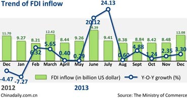 Foreign direct investment (FDI) into the Chinese mainland increased 5.25 percent year on year in 2013 to reach $117.59 billion.
