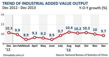 China's industrial output rose 9.7 percent year on year in December, the National Bureau of Statistics (NBS) announced on Monday.