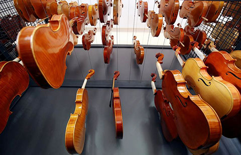 A visitor takes a photo of a violin at the 3rd China International Violin Making and Bow Making Competition Exhibition in Beijing, May 12, 2016. The exhibition will last till May 18. [Photo/Xinhua]