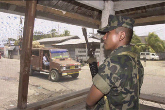 A Filipino Marine guards a checkpoint on the outskirts of Zamboanga in the southern Philippines in this October 13 photo.[Reuters]