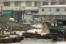 Loose sand reportedly poured into the tunnels being built 20 metres underground. The dyke, about 100 metres from the collapsed building, began slowly sinking on Tuesday night, according to Su Ping, an official from the drainage facility department under Shanghai Water Authority. The wall cracked in the small hours of Wednesday because of the combined effects of subsidence and the rising night tide, according to Su. A site visit Wednesday afternoon found that a pool of water had formed, extending from the cracked wall almost to the collapsed building site. Several other structures had also begun tilting and cracks had appeared in nearby roads as a result of the subsidence. The city government is closely monitoring the accident and has mobilized all the relevant departments. More than 400 police were dispatched to the site, piling up sand bags to form a wall 4 metres high and 30 metres wide by 5 pm Wednesday as a temporary measure to contain the Huangpu River. "My estimation is that the ground around the site sank at least three metres,'' said an official with the city's anti-flood wall construction administration. Sand was also dumped around the fractured wall as a secondary safeguard. But with Thursday afternoon's tide forecast to reach 4.3 metres, the wall of sand bags had to be built higher still, officials said. The city's flood season began on July 1. Structurally unsound buildings around the site of the collapsed building were also being demolished yesterday to lighten the load on the sinking ground. But sources on the rail tunnel construction site said the sand drifts were almost under control. Officials yesterday could not estimate how much the damage would cost, but said it would be difficult to repair, especially since a key drainage pumping facility had been severely affected.