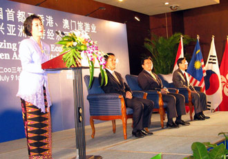 Chong Yoke Har, an official from the Tourism Bureau of Malaysia, gives a speech at a symposium in Beijing on the revival of tourism in Asia on July 9, 2003. The three-day event began July 9. Taking part are officials and representatives of tourism organizations from the Chinese mainland, Hong Kong and Macao and from Malaysia, the Philippines, Singapore, South Korea, Thailand and Viet Nam. [newsphoto.com.cn]