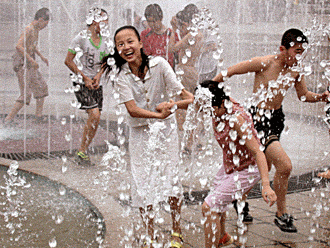 Teenagers find a fun way to escape the scorching heat in Wuhu, East China's Anhui Province. The temperature of the city reached 38 degrees Celsius (100.4 Fahrenheit) on Tuesday, the hottest so far this summer. [China Daily]
