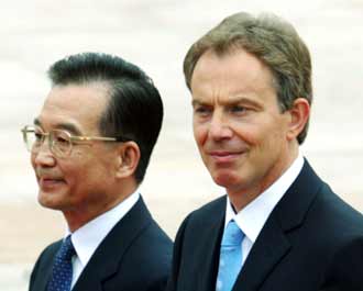 Chinese Premier Wen Jiabao (L) and British Prime Minister Tony Blair review a guard of honour during a welcoming ceremony at the Great Hall of the People in Beijing, July 21, 2003. [Reuters]