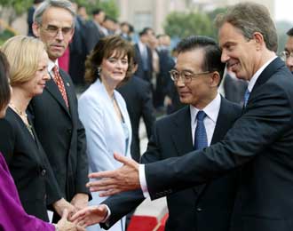 Tony Blair introduces his entourage to Wen Jiabao as Blair's wife, Cherie (C), looks on before a welcoming ceremony in front of the Great Hall of the People in Beijing. [Reuters]