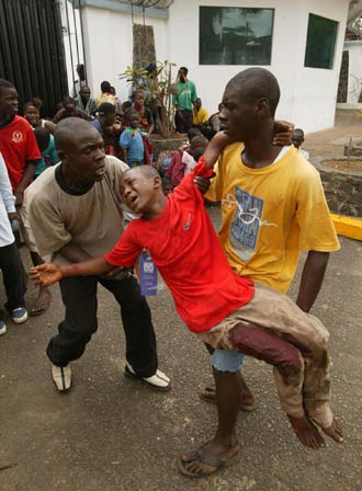 In front of the American Embassy in Monrovia, Liberia, a wounded boy is carried by civilians seeking medical care for him July 21, 2003. [Reuters]