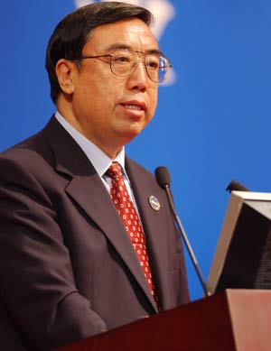 Chinese Minister of Commerce Lu Fuyuan makes a keynote speech at the Asia-Europe High-Level Economic Forum in Dalian, July 22, 2003. [newsphoto.com.cn]