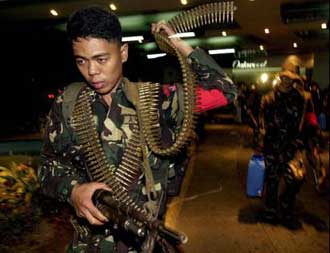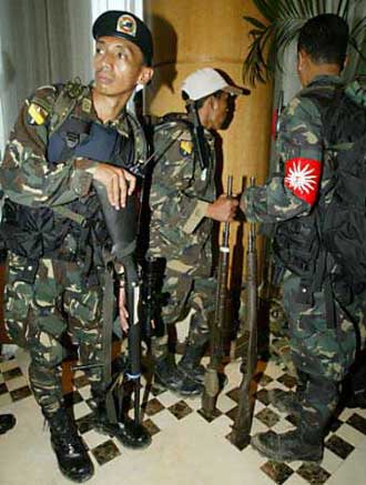 Renegade Philippine soldiers armed with sniper rifles take up positions inside a building in Manila's financial district July 27, 2003. Most of the rebel soldiers said they were willing to negotiate with the government to end a standoff but added they had no immediate plans to surrender. [Reuters]