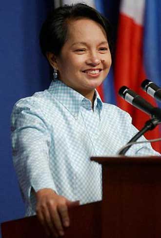 Philippine President Gloria Macapagal Arroyo gives a news conference after she got word from government negotiators that mutinous soldiers who holed themselves up at the financial district of Makati, southeast of Manila, Philippines, agreed to return to their barracks late Sunday July 27, 2003. [AP]