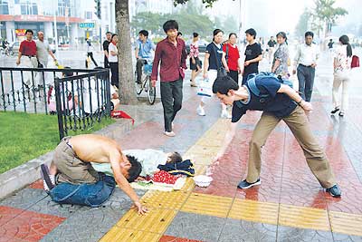 A farmer begs for money in Beijing to feed his son after he said they fled the eastern province of Anhui due to flooding. [Reuters]