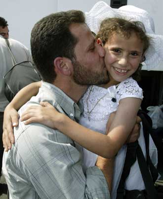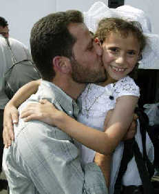 A Palestinian prisoner, released from an Israeli prison, kisses his daughter after he arrives at Tarqumia checkpoint at the entrance of the West Bank city of Hebron August 6, 2003. [Reuters]