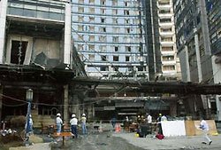 The perpetrators in both attacks used the same kind of explosives and tried to scrape off the identification numbers on the vehicles used. Police also said the Marriott bombers used a mobile phone to set it off — the same method used on Bali.