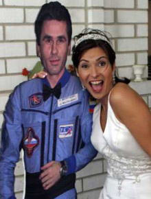 A beaming Dmitriev, dressed in a traditional white wedding dress, told reporters she was very happy, even though she will not see Malenchenko, 41, until he returns to earth in late October or early November. "It was cool; it went straight to the heart," she said, standing next to a life-size cutout of Malenchenko that was to be his stand-in at a space-themed wedding reception. Wedding organizer Jo Ann Woodward said the ceremony, closed to the press, was highly traditional except for the absence of the groom. Friend Harry Noe stood in as his proxy, which is permitted under Texas law, and gave Dmitriev, 26, her ring. At the same time, Malenchenko, who wore a bow tie with his flight suit, slipped on a ring his new bride had shipped earlier to the space station. His crewmate and best man, Ed Lu, played the "wedding march" on an electronic keyboard. Texas judge Bill Yeoman presided over the ceremony, which was conducted in English. Dmitriev said she and Malenchenko began their relationship in April 2002 after meeting at the Outpost Tavern, a favorite astronaut haunt near Johnson Space Center. Neither NASA nor Russian space officials embraced the wedding, but the couple insisted they did not want to wait for Malenchenko's return. Dmitriev, who was born in the Soviet Union but came with her family to the United States at an early age and works in a private business near the space center, said they married now because their long distance relationship had brought them closer. "A long distance relationship is a lot of communication. He was closer to me because of the communication we have," she said. Besides, she added, "it was a celestial soulful connection that we have. I can't explain it to you other than that." The two plan to honeymoon in Australia after Malenchenko's return, then have