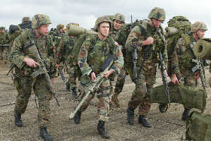 U.S. Marines land in Liberia's capital onThursday to help West African peacekeepers take over security in the hungry and battle-worn city August 14, 2003. U.S. Marines, helicopters and screaming jets backed West African peacekeepers as they pushed into rebel-held areas of Liberia's battle-worn capital Monrovia on Thursday to a riotous welcome. [Reuters]