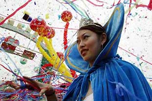 Confetti rains down on the Tsingtao Beer Queen during the opening of the '13th Qingdao International Beer Festival' in China's eastern port city of Qingdao, Shandong Province, August 15, 2003. The session is the largest ever for the annual event, which will wrap up at the end of the month. Brewers from more than 10 nations, including Denmark, Germany, Japan, the United States and France, are taking part in the occasion. [newsphoto.com.cn]
