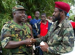 Colonel Mac Nyoyoko, left, shakes hand with General Sheriff, the Chief of Staff of LURD or Liberians United for Reconciliation and Democracy fighters, after LURD handed over the bridge on the Po river, in Liberia, Aug 18, 2003.  [AP]