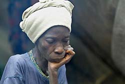 Donweh Bar props up her skeletal frame, wizened beyond her 48 years, with spindly arms wrapped around a twisted cane. Nearby a toddler with protruding belly and ribs eats a few grains of corn meal from her mother's hand.