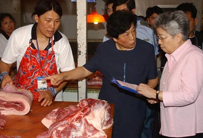 Vice-Premier Wu Yi talks with a pork stand owner during her recent inpecton tour in Beijing to check food safty standards. [China Daily]