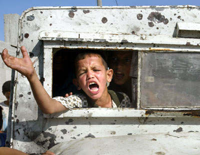| | A Palestinian boy chants anti-Israel slogans from inside a damaged car after the car was hit by missiles fired from Israeli helicopters in Gaza Strip August 30, 2003. Israeli helicopter gunship fired several missiles at a Palestinian car driving through a refugee camp in the central Gaza Strip on Saturday, killing two Hamas militants, Palestinian security officials said. [Reuters] |