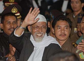 Radical Muslim cleric Abu Bakar Bashir waves as he leaves the courtroom, Tuesday, Sept 2, 2003, in Jakarta, Indonesia. An Indonesian court sentenced Bashir to four years in prison Tuesday for plotting the overthrow of the government, but the judges acquitted him of leading Jemaah Islamiyah, a Southeast Asian terror group linked to al-Qaeda.   [AP]
