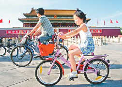 A girl and her mother ride their bicycles past Tian'anmen Rostrum in Beijing. Riding at leisure has become a luxury to many commuters as the city's roads are jammed with vehicles, whose number recently hit 2 million. [newsphoto.com.cn]