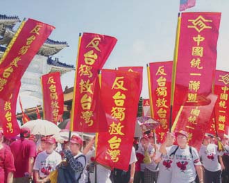 Banners displayed by marchers on the orderly and good natured anti-independence demonstration, which was joined by many passers-by, read: "Against Taiwan Independence," "I am Taiwanese and Chinese as well" and "Direct links for transport, post and trade between Taiwan and the mainland will lead Taiwan to prosperity."