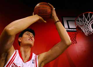 The latest wax figure of NBA player Yao Ming displays at Madame Tussauds in Hong Kong September 30, 2003. Yao is the first mainland Chinese sports star to be cast in wax and takes his place alongside other international sporting greats such David Beckham. [Reuters]