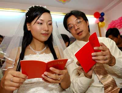 A couple look at their marriage certificate after registration October 1, 2003 in Hangzhou, East China's Zhejiang Province. [newsphoto.com.cn]