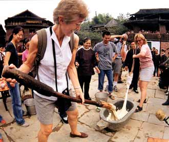 Two US tourists try making "Zanba" a staple food for some of China's ethnic groups, in a Dong minority village in South China's Guangxi Zhuang Autonomous Region last week. "Zanba" is made by pounding sticky rice in a stone mortar. [newsphoto.com.cn]