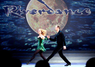 Joanne Doyle and Conor Hayes at a rehearsal of the Irish dance show Riverdance, which was held in the afternoon on Oct 9, 2003 at Beijing's Great Hall of the People. The show had its Chinese debut in the hall last night, and performances will continue each evening until Tuesday. [China Daily]