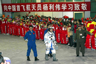 "I will strive to complete my tasks well and ensure the full success of the mission," Yang pledged. Yang then displayed a five-star national flag of China and a United Nations flag, both of the miniature size, in his capsule. This move was intended to highlight China's persistent pursuit of peaceful exploration of space, sources said. *** Congratulations In Washington, Pentagon spokeswoman Cheryl Irwin said, "We wish them success and for their astronaut's safe return." NASA Administrator Sean O'Keefe also congratulated on China's first successful human space flight. "This launch is an important achievement in the history of human exploration. China, after Russia and the United States, is only the third nation to successfully launch humans into space. The Chinese people have a long and distinguished history of exploration. NASA wishes China a continued safe human space flight program." O'Keefe said. Wednesday's launch makes China the third country to put a human into space. The former Soviet Union sent Yuri Gagarin up in 1961; the United States launched Alan B. Shepard Jr. a month later. John Glenn became the first American in orbit in 1962. *** "I will not disappoint the whole nation" CCTV released a picture of Yang Liwei, 38, a pilot since 1983, boarding Shenzhou 5 about 8 am (8 p.m. EDT) Wednesday. "I will not disappoint the whole Chinese people and the motherland. I will complete each movement with total concentration. And I will gain honor for the People's Liberation Army and for the Chinese nation," Yang took an oath before boarding. Yang, who is 5 feet, 6 inches tall, was born in 1965 in Youzhong County in Liaoning province, an industrial area in China's northeast. His older sister said he was an athletic child who enjoyed swimming and ice skating. He works for the Aviation Military Unit of China's People's Liberation Army.