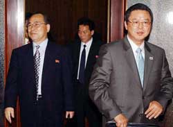 North Korean official delegate Choi Sung IK (L) and his South Korean counterpart Shin En-sang (R) come out from a room of the 12th Inter-Korean Ministerial Talks, at the Koryo hotel in Pyungyang, North Korea, Wednesday, Oct. 15, 2003.  [AP]