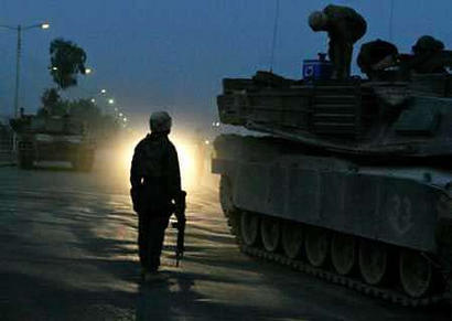 U.S. troops surround a municipal building in the Baghdad suburb of Al Sadr City to secure an area after a police raid October 16, 2003. At least 13 U.S. troops have committed suicide in Iraq, representing more than 10 percent of American noncombat deaths there. [Reuters]
