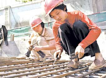 He has been there for almost 12 hours since 6am. Other construction workers now call him for supper. Slowly rising to his feet, he tries to climb down the scaffolding with stiff limbs. When standing on the ground, his first instinct is to wash his hands. He has reduced toilet breaks to a minimum, because climbing up and down the scaffold is not safe and time consuming. The supper is simple with three dishes: cabbage, sweet potato noodles and fresh kidney beans fried with shredded meat. They are heated in big basins and about 100 workers queue up to get their share. Chen is hungry. Sitting on a wood block at a corner, he wolfs down everything in his bowl. In fact, he is quite satisfied with the meal. It is free and he can ask for additional steamed buns. He has worked in other construction companies where he has had to pay for food no better than this. He lives with eight construction workers in a small basement room. Four bunk beds and numerous big trunks are crowded in the 15 sqm space and the ceiling is less than two metres high. There's no TV, newspapers or radio. Taps for water are out in the yard. The only diversions available for him and his roommates in the evening are to chat and playing cards. Usually, though, they choose to sleep soon after supper because they are all exhausted after a day's hard work. Yet sometimes he cannot sleep. He misses his wife and daughter in Anyang, Henan Province terribly. And these days he is especially worried because his wife wants to divorce him. "It is not her fault," he told the reporter. "I spend too little time at home." Usually only during the Spring Festival does he get the chance to go home. "But I have no choice," Chen continues. "Here I can get about 1,000 yuan (US$120) a month to support my family. If I go home and do some farming, I cannot afford any expense besides food and my daughter's tuition." Her tuition costs about 200 yuan (US$24) a year. Though he himself has little education, Chen dreams of supporting his daughter to go to college in the future: "In rural areas a lot of children don't continue studying after graduating from primary school. "But I want my daughter to study in Beijing and find a decent job in the capital. I will be very proud if she is well educated like other Beijngers." An excavator driver Wang Zhixin, about 35 years old, has worked amidst dust and din for seven years. Every morning he climbs into the tiny cab of an excavator and begins a hard day's work operating the giant machine, repeatedly digging holes on construction sites. Working 14 hours a day is not unusual: "If the project is running behind, working overtime is a must. Only in the heaviest rain will work be suspended. We put up with this, knowing that if the boss is penalized for any delays, our payment will be decreased in the end. "