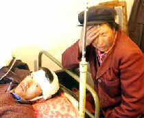 Zhang Aiqiao (R), 20, weeps beside her husband who was wounded as their house collapsed during an earthquake early Thursday in Minxian County, Gansu province. At least a child was killed and 25 other villagers were wounded in the earthquake.[newsphoto.com.cn]