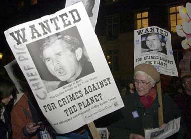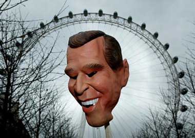 Anti-war protesters march through London, Tuesday Nov. 18, 2003, on the night that U.S. President George W. Bush arrived for his state visit. While in London Bush will be a guest of Britain's Queen Elizabeth II at Buckingham Palace.  [AP]