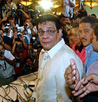 Popular Philippine movie actor Fernando Poe Jr. glances to the crowd after making a brief announcement to run for President in the May 2004 Presidential elections at a Manila hotel, Philippines, Nov. 26, 2003.   [AP]