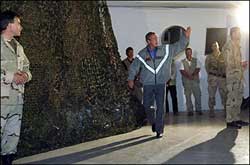 US President Bush greets troops after arriving at Baghdad International Airport Nov. 27, 2003 in Baghdad, Iraq.   [AP]