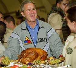 US President Bush holds up a turkey platter for US troops at Baghdad International Airport Nov. 27, 2003 in Baghdad, Iraq.  [AP]