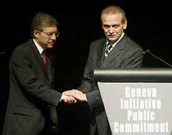 Head of the Palestinian delegation to the Geneva Initiative, Yasser Abed Rabbo (R), and head of the Israeli delegation, Yossi Beilin, shake hands during the launch of an unofficial Swiss sponsored Middle East peace plan, dubbed the Geneva Initiative, in Geneva Dec. 1, 2003.  [Reuters]