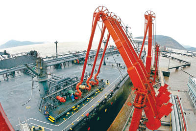 The Aoshan project, for instance, is designed to cover a land area of 130 to 150 hectares, including a port capable of docking 250,000-dwt (dead weight ton) ships. An investment of 3 billion yuan (US$362.7 million) will be required to build oil tanks with a total volume of 5 million cubic metres by 2007.