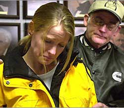 Carrieann Williams is comforted by her father in-law Theodore Williams after speaking to reporters about the flu death of her 8-year-old son Nov 25, 2003. [AP]