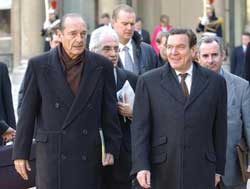 French President Jacques Chirac, left, and German Chancellor Gerhard Schroeder, right, cross the courtyard of the Elysee Palace on their way to the nearby Hotel Marigny to have lunch, Tuesday, Dec. 9, 2003 in Paris.   [AP]