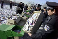 Police officers destroy confiscated pirated software discs and pirated DVDs and VCDs Friday in Yizhuang Economic Development Area of Beijing. [newsphoto.com.cn]