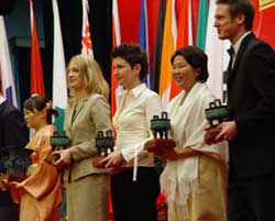 Prizewinners at the second Chinese Bridge Contest were awarded at the Great Hall of the People on Dec. 22, 2003. [NOCFL]