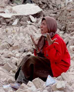 An Iranian woman cries amid the ruins of her house in the devastated town of Bam, south-eastern Iran, December 28, 2003. International rescue teams were flying into Iran on Saturday to join a frantic search for survivors from an earthquake that devastated the ancient Silk Road city of Bam, killing more than 20,000 people. [Reuters]