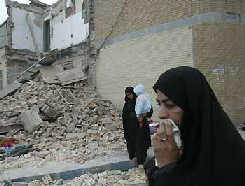 An Iranian woman covers her face with a scarf from the smell as she walks past a destroyed house in the heart of the ancient city of Bam December 28, 2003. The stench of death filled Iran's earthquake-devastated city of Bam on Sunday and fears of epidemics and looting grew as hopes dwindled for those still buried by a disaster that killed 22,000 people. [Reuters]
