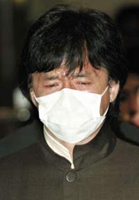 Action movie Jackie Chan grieves over the death of pop diva and actress Anita Mui, at a hospital in Hong Kong, December 30, 2003. [Reuters]